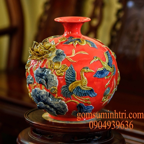 Bình hút tài lộc gốm sứ Bát Tràng, được khắc tay thủ công, đắp nổi men màu, các chi tiết tỉ mỉ sắc nét