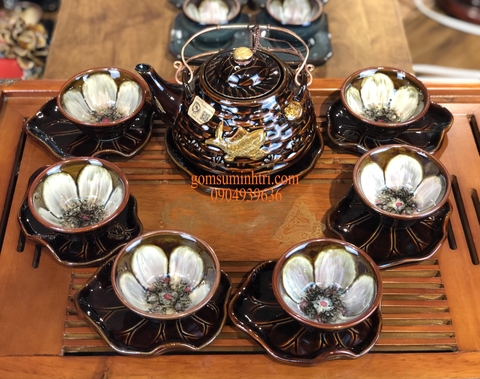 Bộ sản phẩm ấm chén gốm Bát Tràng, sản phẩm được nung ở nhiệt 1280 độ c, loại bỏ hoàn toàn tạp chất, an toàn cho người sử dụng .