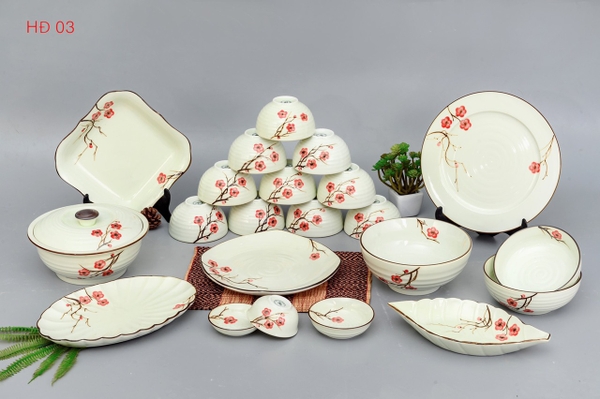 Bộ đồ ăn men kem vẽ hoa đào SET 03 - gốm sứ Bát Tràng cao cấp