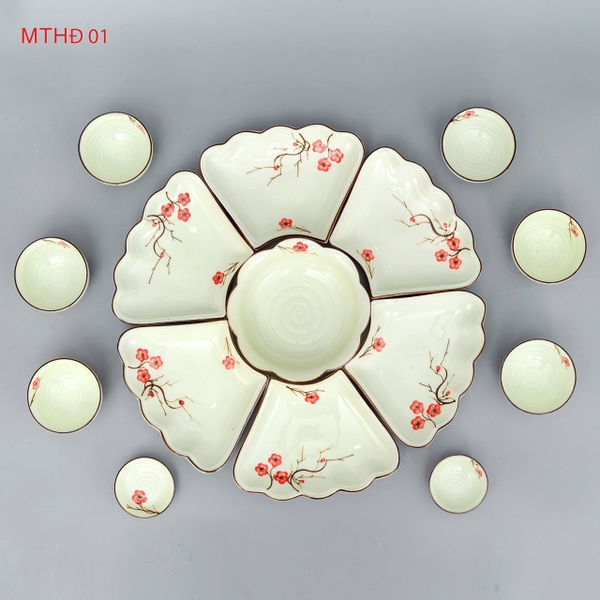 Bộ hoa mặt trời men kem vẽ hoa đào Size 1 - gốm sứ Bát Tràng cao cấp