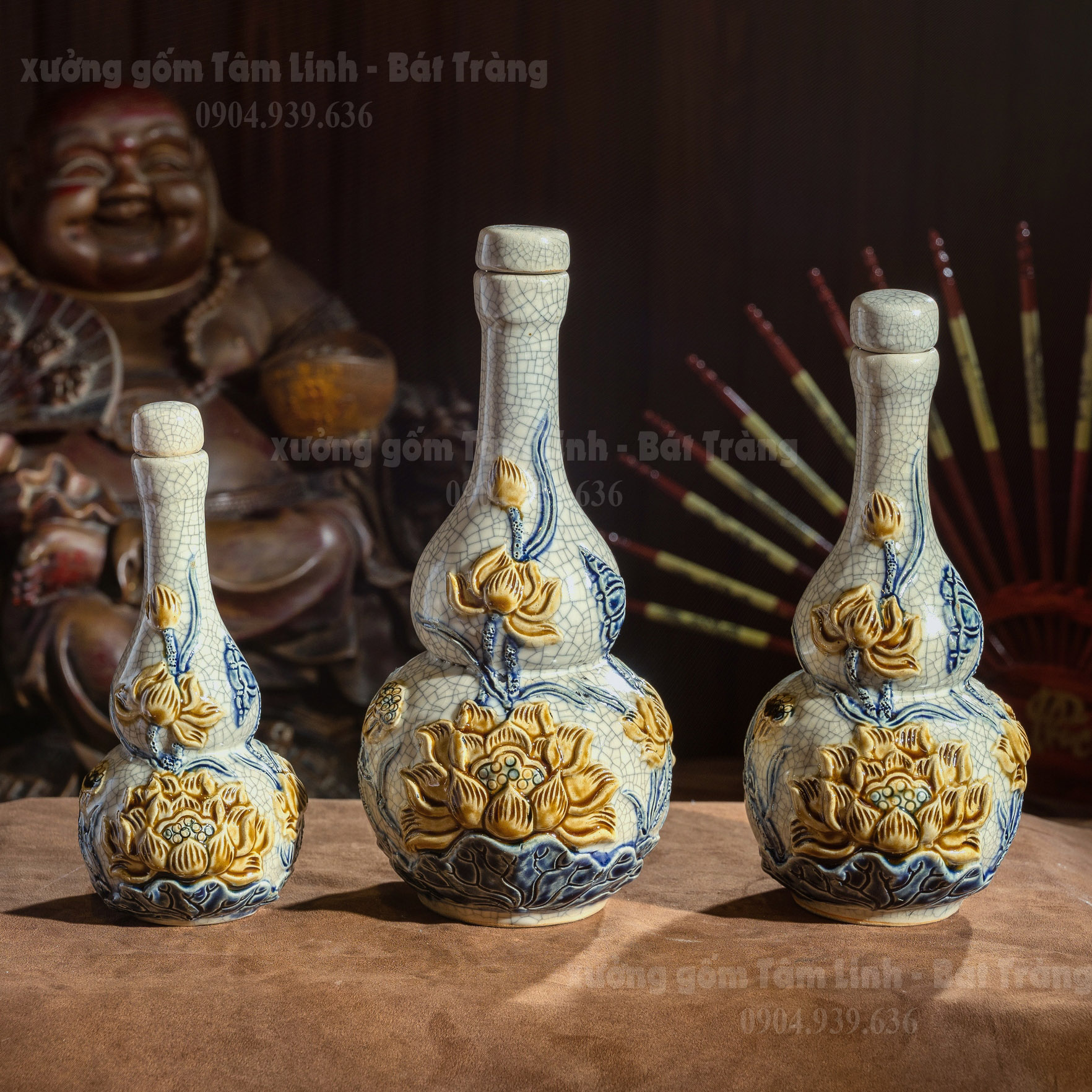 Nậm rượu 2 bầu sen men rạn đắp nổi men rạn Bát Tràng